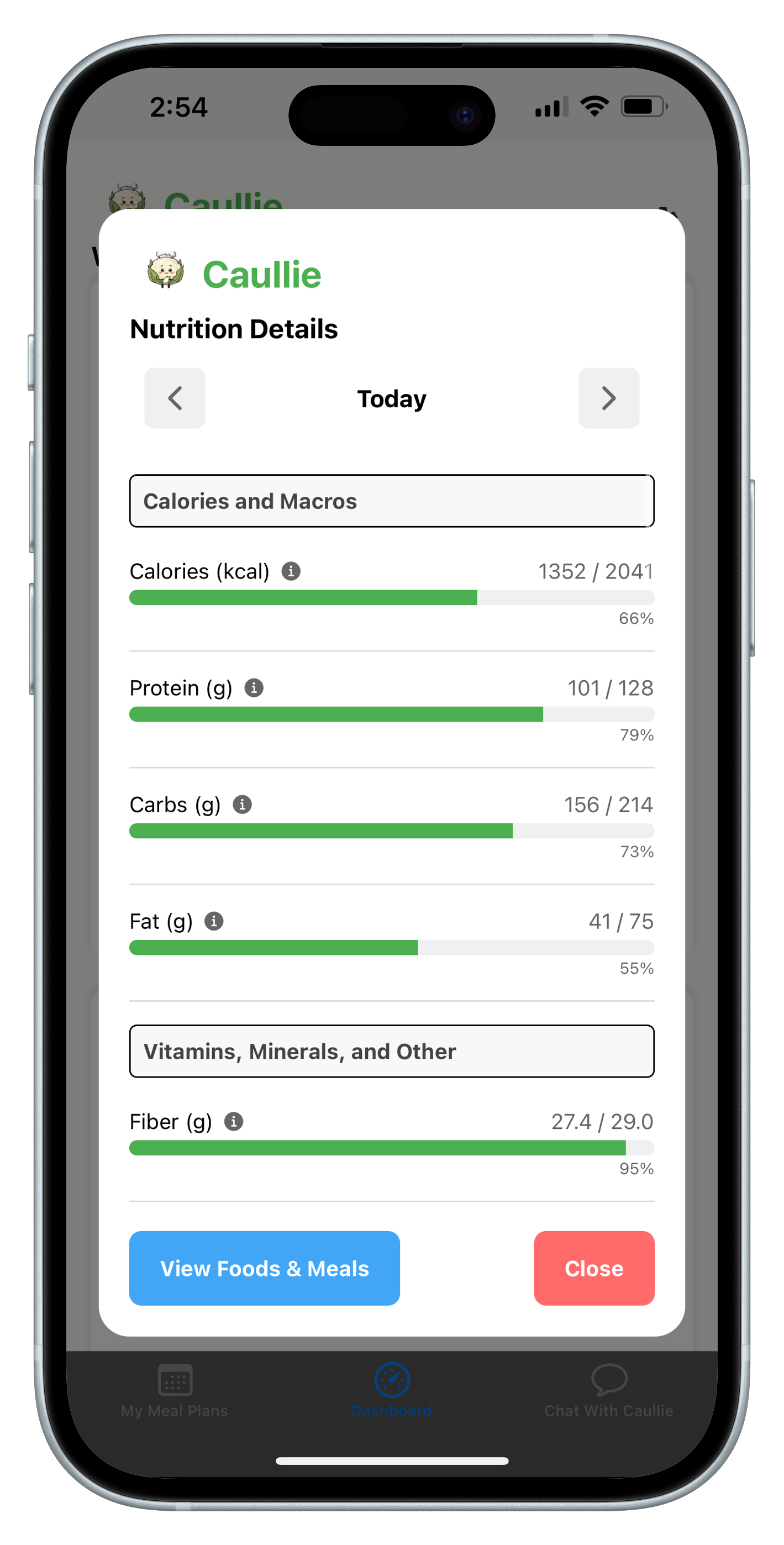 ✓ Hit Your Macros and Micros – Caullie helps you target your protein, fat, and carb intake, and 25+ other micronutrients.